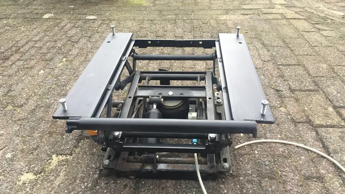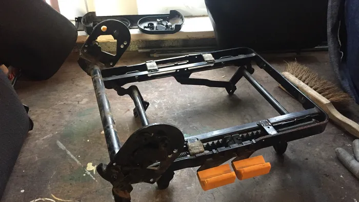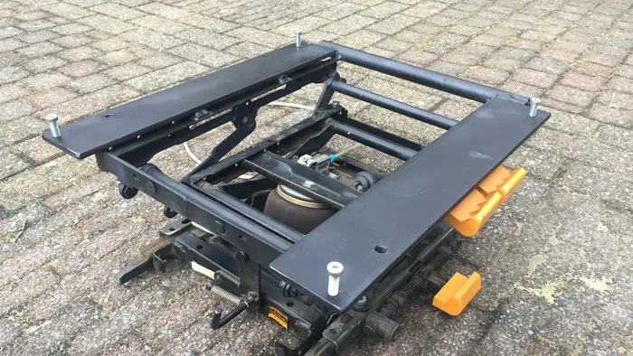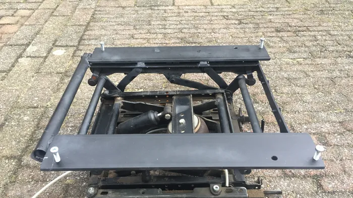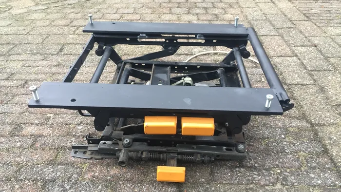 The backrest was removed and two 5mm plates are welded to the frame. The seat sliders are bolted to the adapter frame and counter secured with self locking nuts.